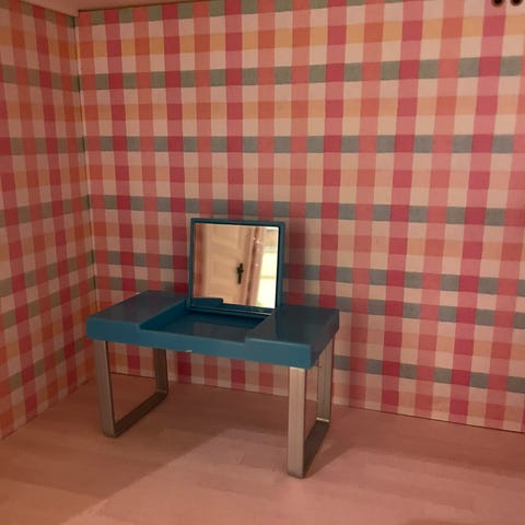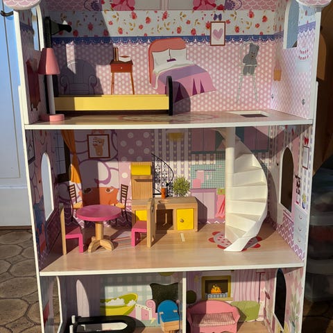 Lundby dukkehus med underetasje, flere rom og møbler. Inneholder blant annet 2 soverom, 2 stuer, bad og hall med pianoområde. Rommene har tapetsert vegger i ulike mønstre og farger, samt møbler som seng, sofa, stoler, bord, toalett og piano. Kontakt til lys følger med.