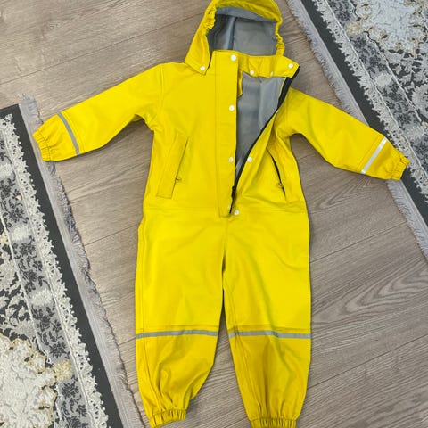 Hel og fin regndress, ingen skader, men uten fotstropper. Vært veldig fornøyd med denne!