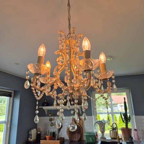 Nydelig gullfarget prisme taklampe og 1 stk vegglampett.