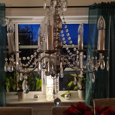 Taklampe måler 72cm fra take og ned,og 41 cm tvers over.5 stk lyspærer.