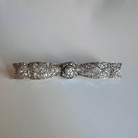 Brosjen er besatt med én gammel briljantslipt diamant på ca. 0,35 ct, 2 brilliantslipte sidestener totalt beregnet til 0,20 ct, samt 12 roséslipte diamanter (totalt ca. 0,13 ct) og 12 mindre diamanter i sidene (totalt ca. 0,33 ct).