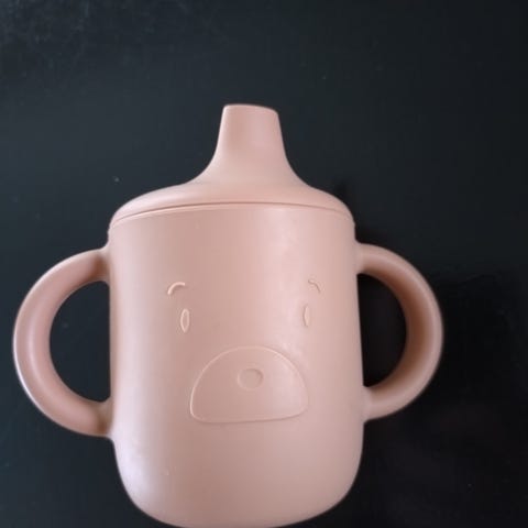 Pent brukt sett med tallerkner og tutekopp, med motiv fra Putte i Blåbærskogen. Alt er pent brukt, enklere bitemerker på tuten på lokket til koppen.