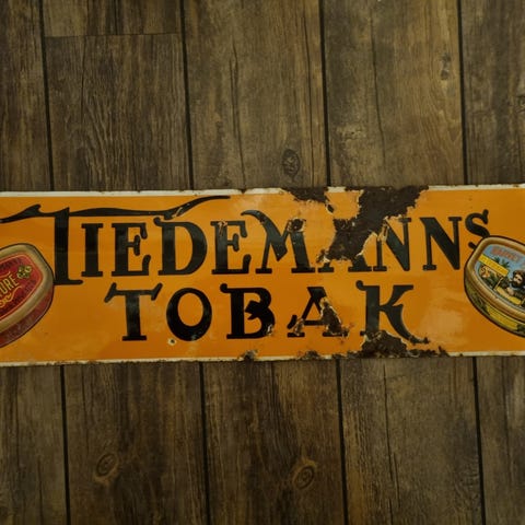 Tiedemanns Skraa emaljeskilt med blå tekst på hvit bakgrunn. Skiltet har noen rustmerker i hjørnene og er rektangulært i formen.