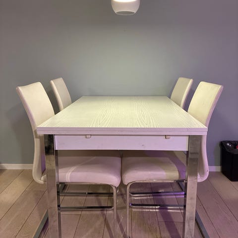 Dette er et pent brukt sett. Men stolene trenger å fjerne trekket under da denne. Sverter litt farve av det svarte trekket. Se på bilde. Ganske enkelt å ta av. Bord platen veier litt da dette er herdet glass.