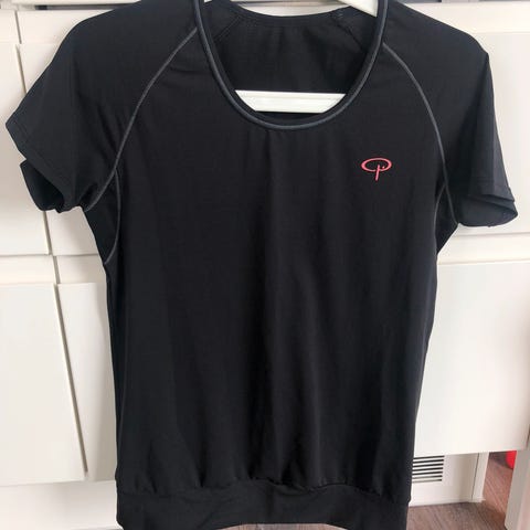 Kari Traa trenings T-skjorte i størrelse L for dame. T-skjorten har svart hovedfarge med grålilla detaljer på skuldrene. Egnet for løping og annen fysisk aktivitet.