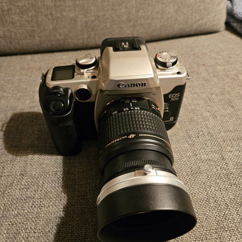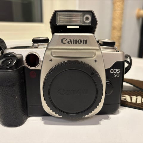 Canon EOS 50E analogkamera med innebygd blits og et zoomobjektiv.