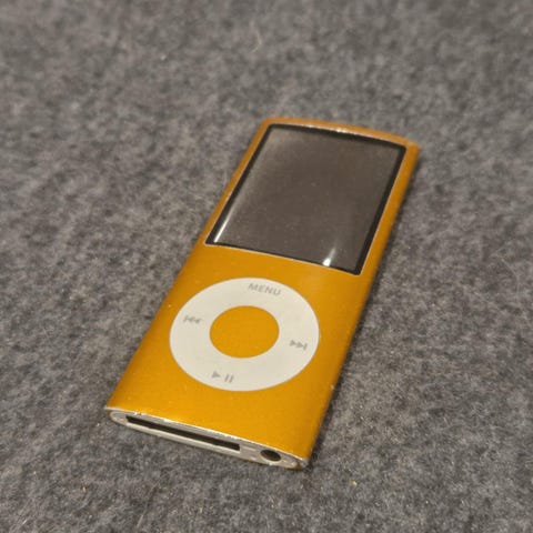 Apple iPod Mini MP3-spiller i blå farge. En bærbar musikkspiller med kontrollknapper for avspilling, volum og låsefunksjon. Utstyrt med en liten skjerm for visning av informasjon om musikken.