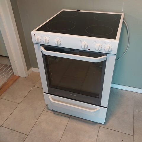 Electrolux keramisk komfyr med fire kokeplater i svart keramisk glass. Komfyren har en hvit farge og et ovnsrom med ovnsdør i glass.