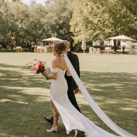 Kjolen er kjøpt ny og kun brukt av meg, og bare frem til kveldsdelen av bryllupet (jeg byttet senere til en kortere kjole).