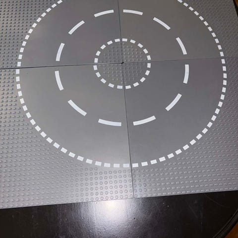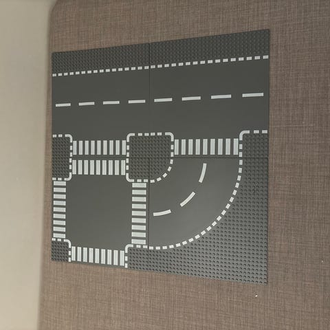 LEGO City veiplater med veimønster i mørk grått og hvitt. Platene inkluderer rette og buede veistykker samt et veikryss. Egnet for bygging av bymiljøer og veier i LEGO City tema. Se bilder for utseende og tilstand.