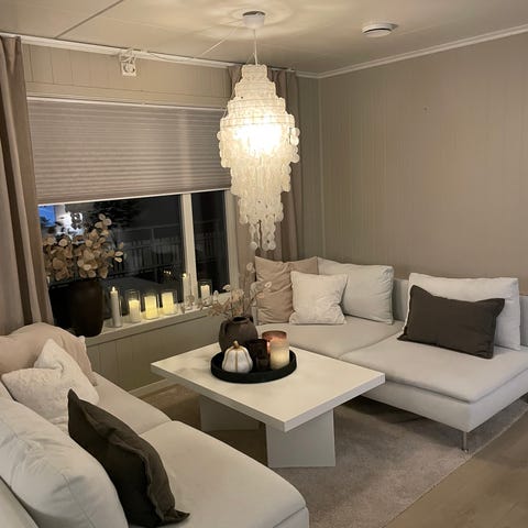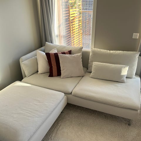 Trekkene er nyvasket og det er ingen flekker, men glidelåsen som holder putene på plass i sofaen er ikke i orden. Dette har ikke vært noe problem. Nye trekk kan kjøpes på IKEA så her velger du selv hvilken farge du ønsker. Du har også masse utbyggingsmuligheter.