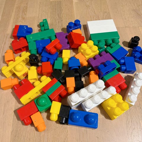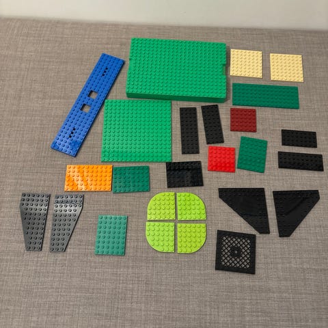LEGO byggeplater i ulike farger. Platene er firkantede og kommer i fargene svart, hvit, blå, grønn, grå og beige. De kan brukes til konstruksjon og bygging med LEGO-klosser.