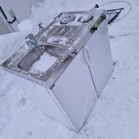 Alle skap er hele og fine, unntatt et av underskapene hvor det har stått en varmtvannsbereder. Der er bunnen vannskadet. Skapet under vasken er helt, men med utskjæringer for rør. To overskap har utskjæring for gjennomføring av avtrekk for vifte. Alle skapdører er heltre eik, men malt. Benkeplater og vask/blandebatteri følger med. Med litt vask, maling og kjærlighet kan dette bli et fint kjøkken på hybelen eller hytta. Gis bort mot henting. Det som ikke er hentet før mandag 5. januar går i container.