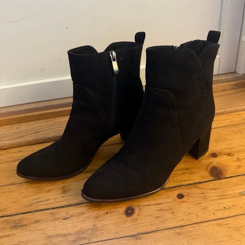 Elegante sorte heler/ankelboots i myk fløyel fra merket RAID. Hælhøyde ca. 10 cm. Skoene er pent brukt kun én gang og fremstår i svært god stand. Har litt støv etter lagring, men dette kan enkelt fjernes.