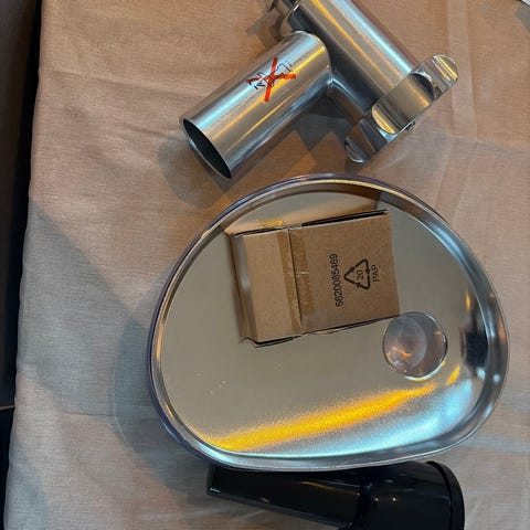 Kenwood KitchenAid kjøttkvern tilbehør med metallkomponenter og plastdeler. Passer til flere Kenwood maskiner siden det er en ekstra overgang som følger med. Alt som følte med som ny og en overgang, som gjør at den kan brukes på enda flere Kenwood maskiner.