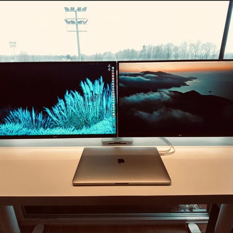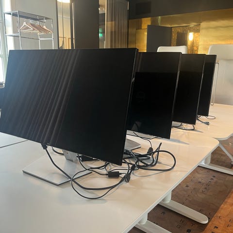 Gir langt bedre ergonomi og mer plass på pulten. Skjermene kan justeres individuelt i høyde, vinkel og avstand. Har integrert USB-port samt mic/hodetelefon-utgang i basen for ryddig oppsett.