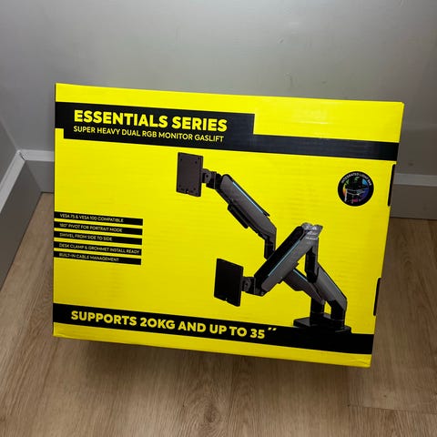 Solid dobbel skjermarm for to skjermer, kjøpt fra Komplett.