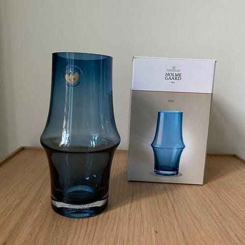 Selger stor Holmegaard 'Karen Blixen' koboltblå vase. Den er i veldig fin stand, uten skader, nag/skår eller lignende, ekstrem lite bruksslitasje under. Størrelse H: 31 cm, Ø på toppen: 17,5 cm, Ø bunnen: 10,5 cm.