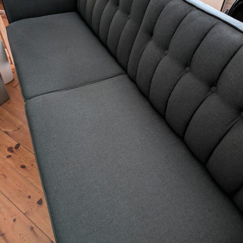 Pent brukt sovesofa. Mørkt grå. Kan speilvendes i følge annonse Jysk.no. Per nå montert med sjeselong som vist på bilde nr.2 der ekstra oppbevaringsrom er åpent.