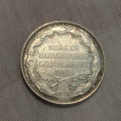 Det ble bestemt at det skulle lages 3 ulike mynter ved unionsoppløsningen med Sverige. Denne er den mest sjeldne av disse tre utgavene.