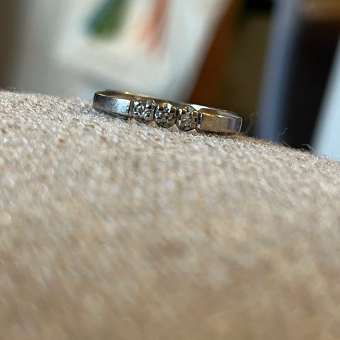 Allianse ring i hvitt gull (stemplet 585) med 3 diamanter. Selges hbo 4500,-