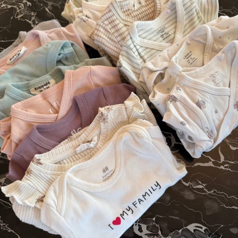 Selger en pakke med babyklær, body, bukser, genser, lue