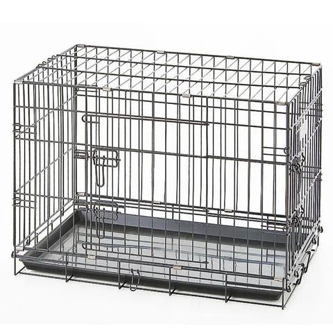 Sort metall hundebur med to dører, en på kortsiden og en på langsiden. Buret kan foldes sammen for enkel oppbevaring og transport. Egnet for å sikre hunder under transport.