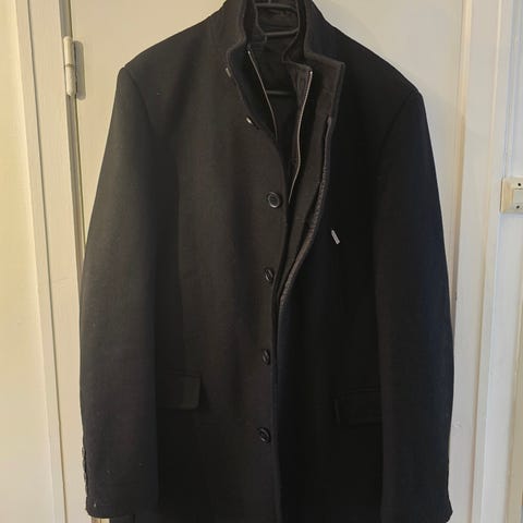 Dressmann herrefrakk i navy blue farge, laget av ull selges. Passer en kraftkar i størrelse 60 og større. Str på frakken er 66.