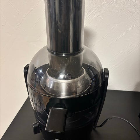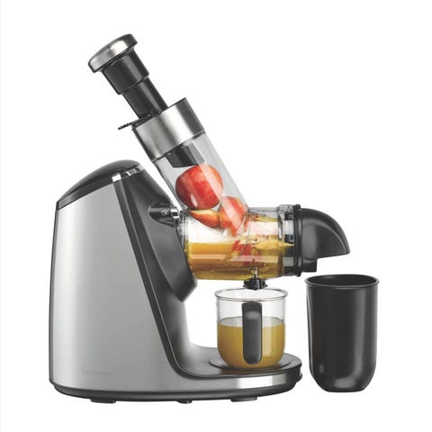 JuiceMaster Slow Juicer i svart og sølv. Kjøkkenapparat for kaldpresset juice, laget for å bevare næringsstoffer i frukt og grønnsaker. Inkluderer beholder for juice og fruktkjøtt. Egnet for hjemmebruk. Enkel montering og rengjøring. Nypris kr 1900,-