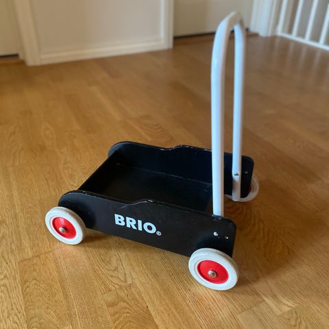 BRIO gåvogn for barn med svart kropp, hvit håndtak og hjul med røde detaljer. Laget i tre og plastmaterialer. Designet for å hjelpe små barn med å gå og balansere. Kun en eier. Uten skader eller slitasje.