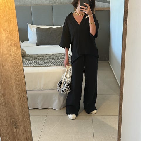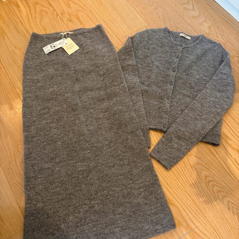 Pent og stilrent sett fra Gina Tricot, bestående av blazer og bukse i lys beige farge.