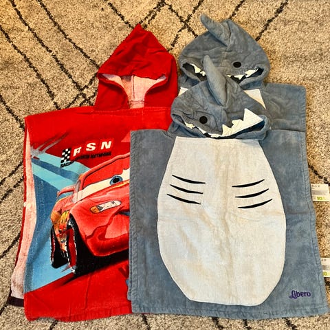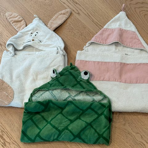 2 stk hettehåndkle frå Kid med sjiraff-motiv. Vaska og brukt ein gang. Hetteopning vart liten for barn på 4-5 år. Nypris 399 per stk. Selges for 80kr per stk.