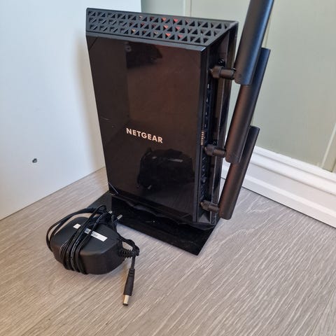Netgear trådløs router med innebygd strømkontakt. Utstyrt med to antenner for bedre signalstyrke og rekkevidde. Designet for å kobles direkte i stikkontakt, noe som sparer plass og gir enkel installasjon.
