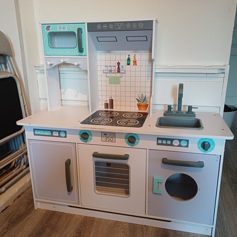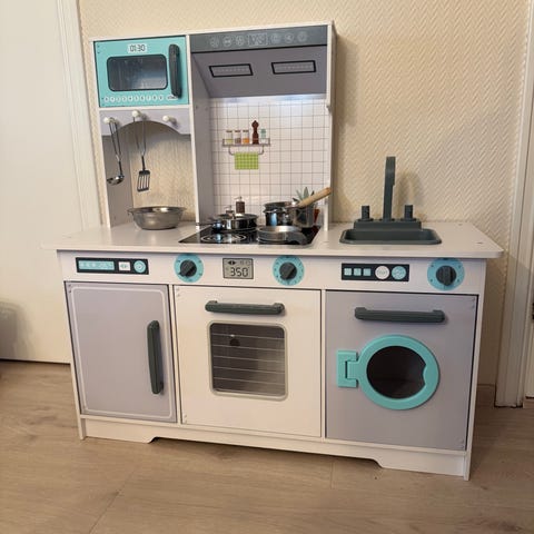 Lekekjøkken i hvitt med trefarget benkeplate. Lekekjøkkenet inkluderer komfyr med ovn, vask, mikrobølgeovn og hyller for oppbevaring. Leveres med et utvalg tilbehør som kjeler, kopper, kaffeapparat, og diverse kjøkkenredskaper. Passer for barn som ønsker å etterligne matlaging og kjøkkenaktiviteter.