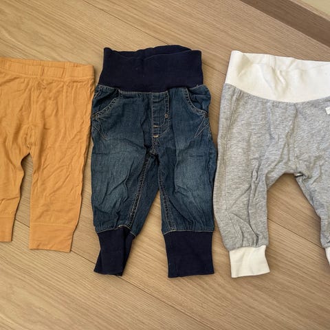 Flerfarget gutt barn klær i størrelse 74. Inneholder ulike plagg som bukser, gensere, jakker og bodyer egnet for små barn.