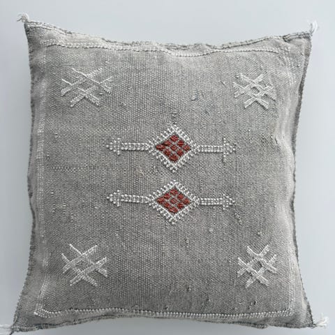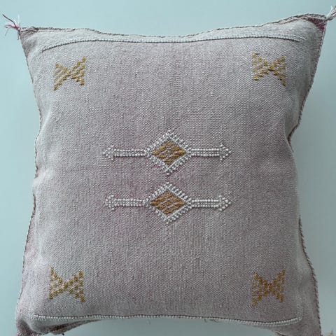 Vakre berberputetrekk i slitesterk agavesilke, nylig kjøpt i Marrakech. Ca. 50 x 50 cm. Hvert putetrekk er unikt, så målene variere noe. Håndvevd kelim, med naturlige fargepigmenter fra planter og mineraler. Stoffene har deretter blitt bleket. Glidelås i siden og ensfarvet bakside.