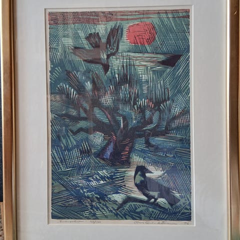 Litografi av Rolf Nerli. Rammet inn hos rammemester. Str inkludert ramme er 27,5× 27,5 cm. Selve bildet uten det hvite rundt er 17×17 cm