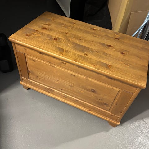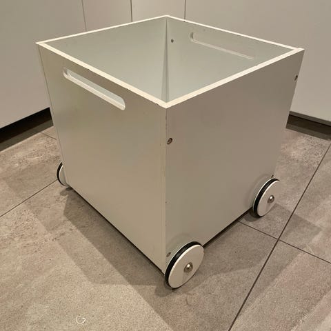 Treboks/kasse på hjul med sølv trekantmønster og tau som håndtak.