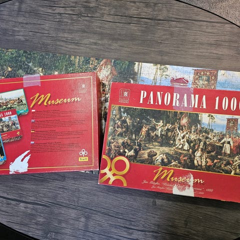 Tusenfryd puslespill som viser to barn med stråhatter og en valp. Puslespillet har et fargerikt motiv med barn og dyr, egnet for barn. Alle brikkene er der, men mangler en bit av ramma. Ca 50 år gammelt. Ca 24 x 27 cm.