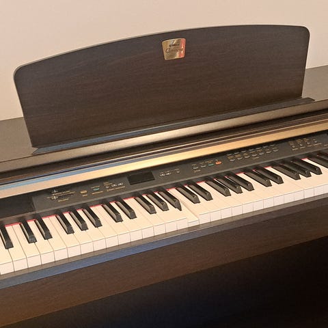 Yamaha Clavinova Piano i svart farge fra 2016. Pianoet har en klassisk design med tre pedaler og en tilhørende benk.