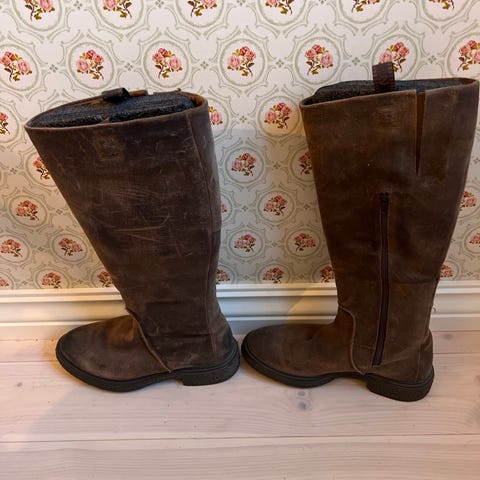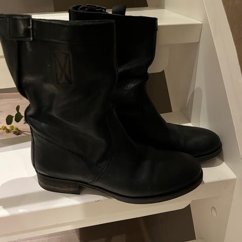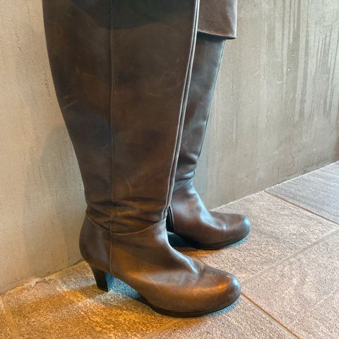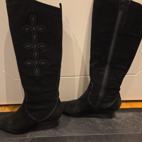 ECCO støvler i størrelse 38, laget av svart skinn. Støvlene har en høy skaftdesign og en hæl som gir ekstra høyde. Egnet for bruk i kaldere vær eller som en del av formelt antrekk.