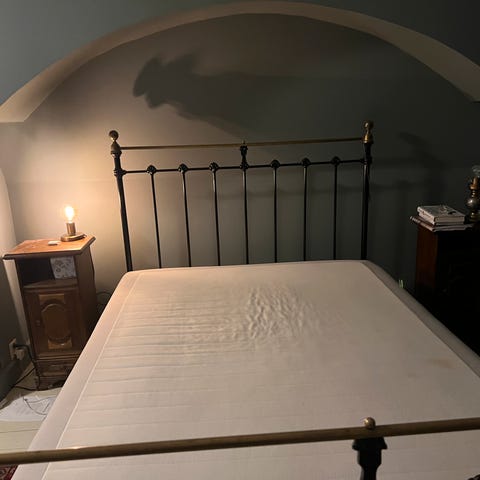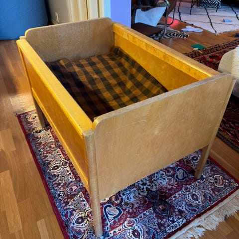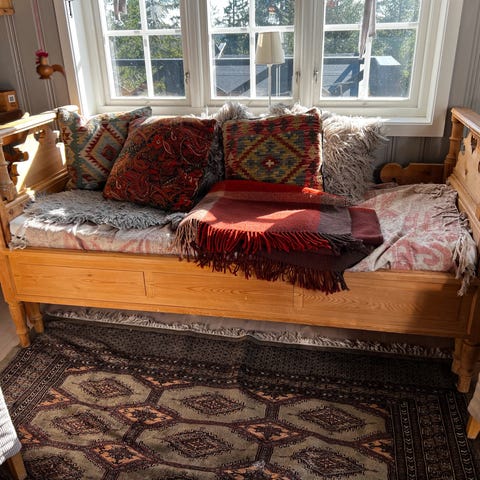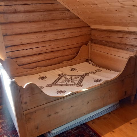 Gammel og sjarmerende skyve seng. Kan brukes som benk, barneseng, avlastning.