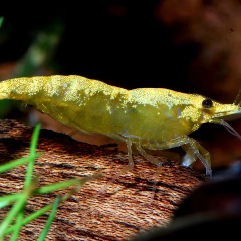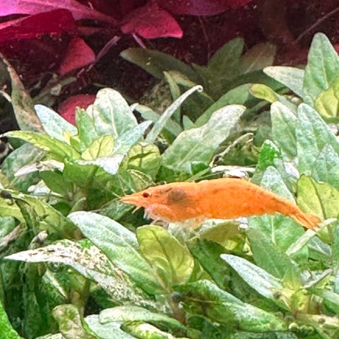 Disse Neocaridina-rekene (Red Cherry / wild type) blir ganske små.