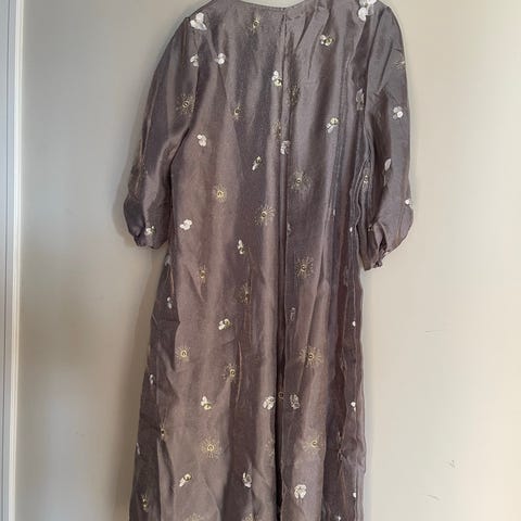 Festkjole i sølvfarget polyester, størrelse 42 for dame. Kjolen har 3/4 lange ermer og et mønstret, dekorativt design. Kjøpt for 2400.
