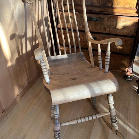 Nydelig antikk gyngestol selges. Den har en veldig fin farge og patina. Denne kan brukes av alle og passer fint inn i stua, på hytta eller i drivhuset. Ubehandlet og lyst fint treverk.