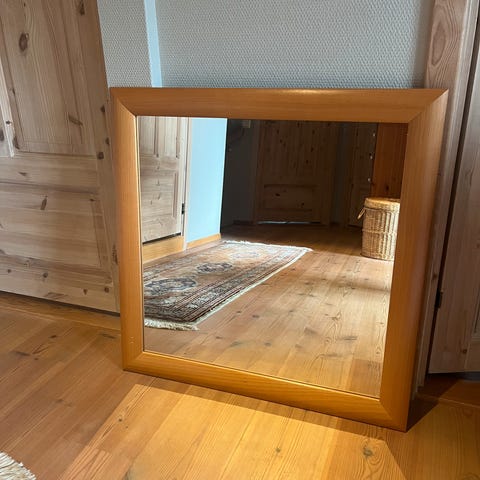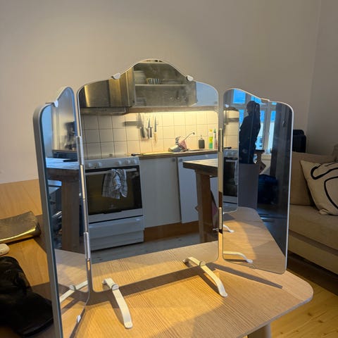 Pent og praktisk speil med sort ramme og stabilt stativ. Kan vippes/justeres, dobbelsidig med forskjellig forstørrelse på hver side. passer godt til bad, sminkebord.