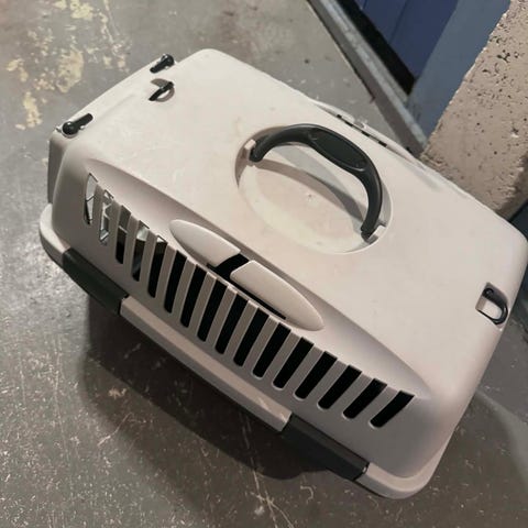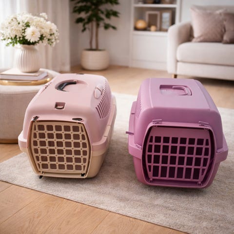 Transportbur laget i plast med ventilasjonsspalter og metallgitterdør med låsemekanisme. Utstyrt med bærehåndtak på toppen for enkel transport. Egnet for små kjæledyr som katter.