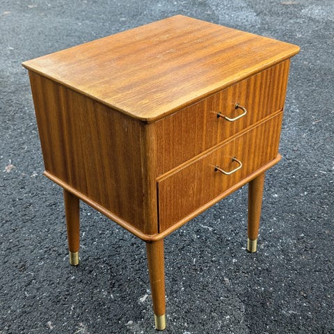 søkeord: retro vintage nattbord sidebord lite liten kommode teak mahogny teaknattbord teakkommode stue kjøkken entremøbel entré kontorskap lagring liten oppbevaring kontor møbel kontormøbel soverom sidebord skuff skuffer skuffeseksjon