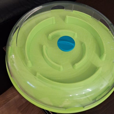 Hundeleke, brukt med noen synlige merker men like hel og funksjonell. Hundens oppgave er å flytte på brikker for å finne godbiter som du har gjemt under brikkene. Laget i plastmateriale som er lett å holde rent og tåler mye.