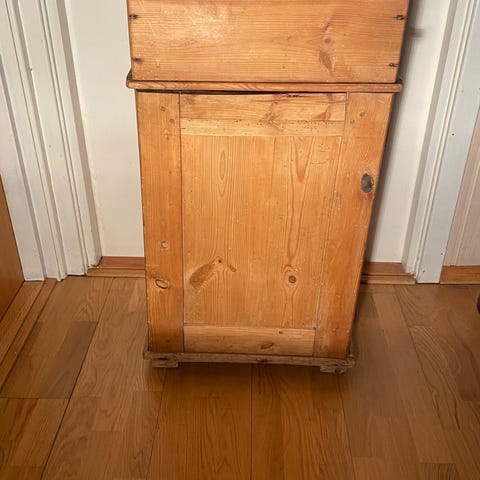 Vintage vaskevannsbord laget av furu. Bordet har en dør med hengsler og en låsemekanisme. Passer til oppbevaring og dekorative formål.